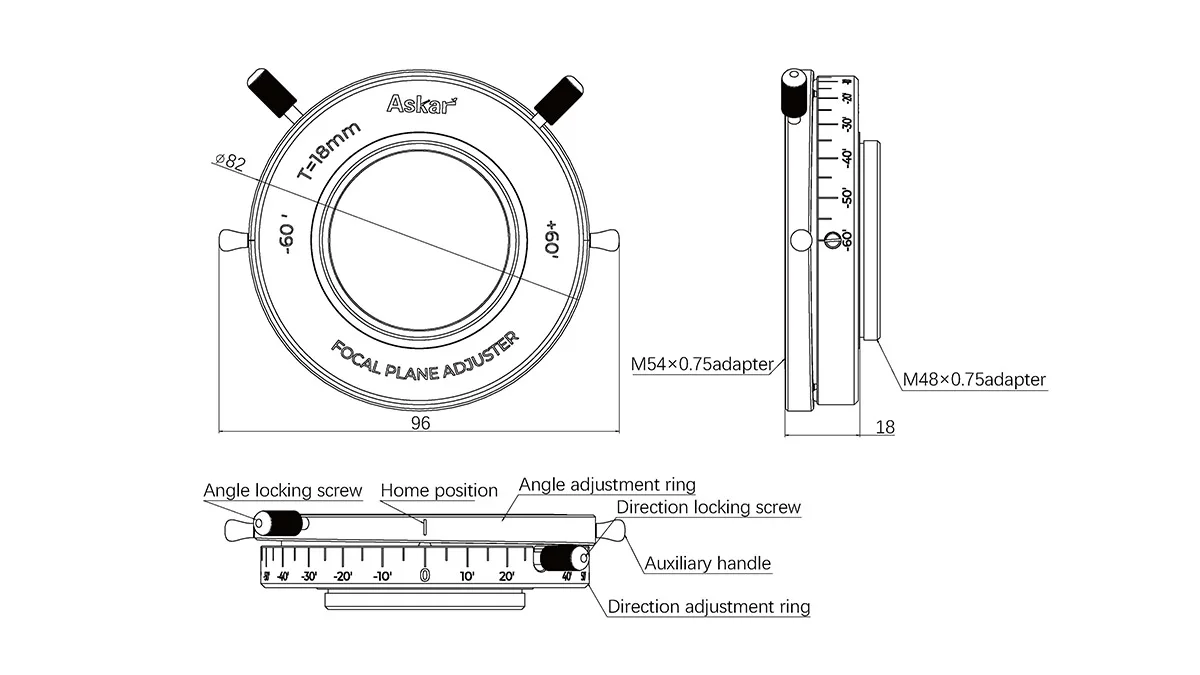 The Askar Focal Plane Adjuster offers an angle adjustment range of ±1° and is printed with 5′each scale for easy adjustment.