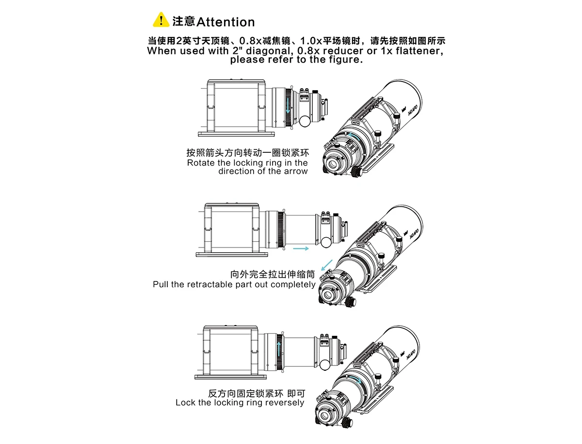 The 1.0x flattener adopts a triplet design and supports a 44mm full-frame image circle. The overall weight is 0.75kg. The back focus from the M48 thread is a standard 55mm. The front thread is M92*1. At the camera end, it is equipped with M68*1, M54*0.75 and M48*0.75 three sizes of adapters, which are convenient for connection. At the same time, it has a built-in M48*0.75 2-inch filter thread, which can be directly installed and used. The overall CNC machined, both end threaded metal caps prevent ash when not in use.