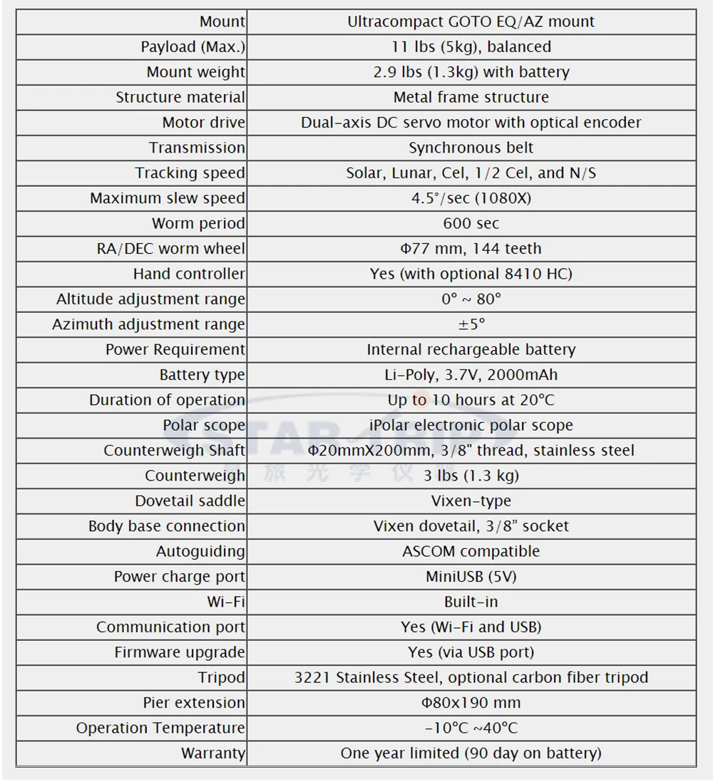 Weighs only 1.3kg / 2.9 lbs (including internal rechargeable battery) but can support 5kg / 11 lbs payload in both equatorial and alt-azimuth modes.