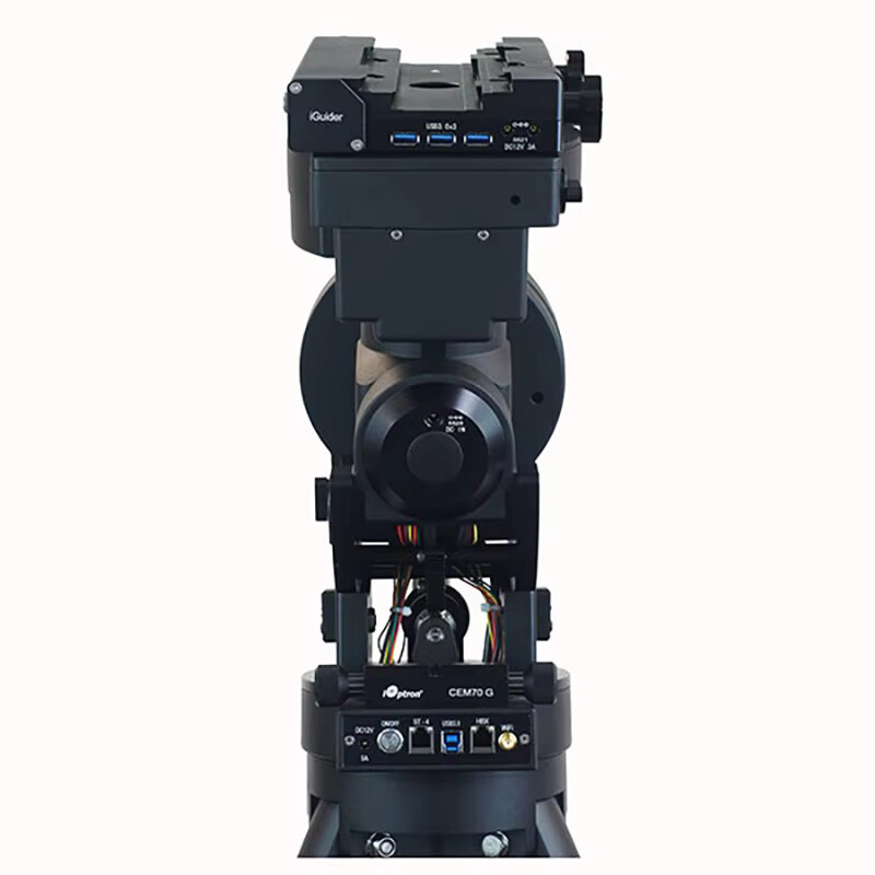 Innovative operational features such as the internal iPolar electronic polar scope, easy lock drive gear engagement (levers large enough to use with gloves), an advanced cable management system for the mount, iPolar, iGuider (guider, and camera), and cumulatively assure users the CEM70 and this model CEM70G designed with their needs in mind. On top of the built-in guiding system the CEM70G also comes standard with WiFi and USB 3.0.