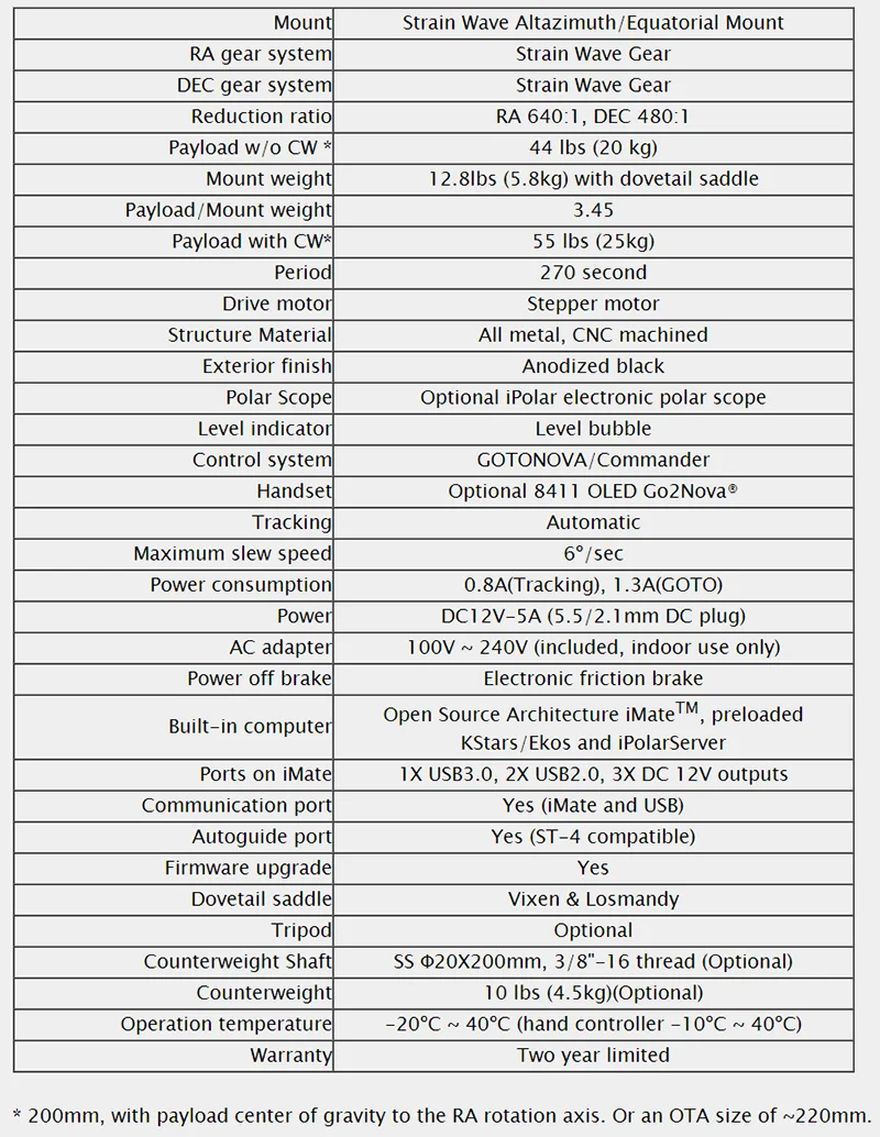 - Payload capacity of 20 kg (44 lbs) with the mount weight of 5.8 kg (12.8 lbs, include dovetail saddle)