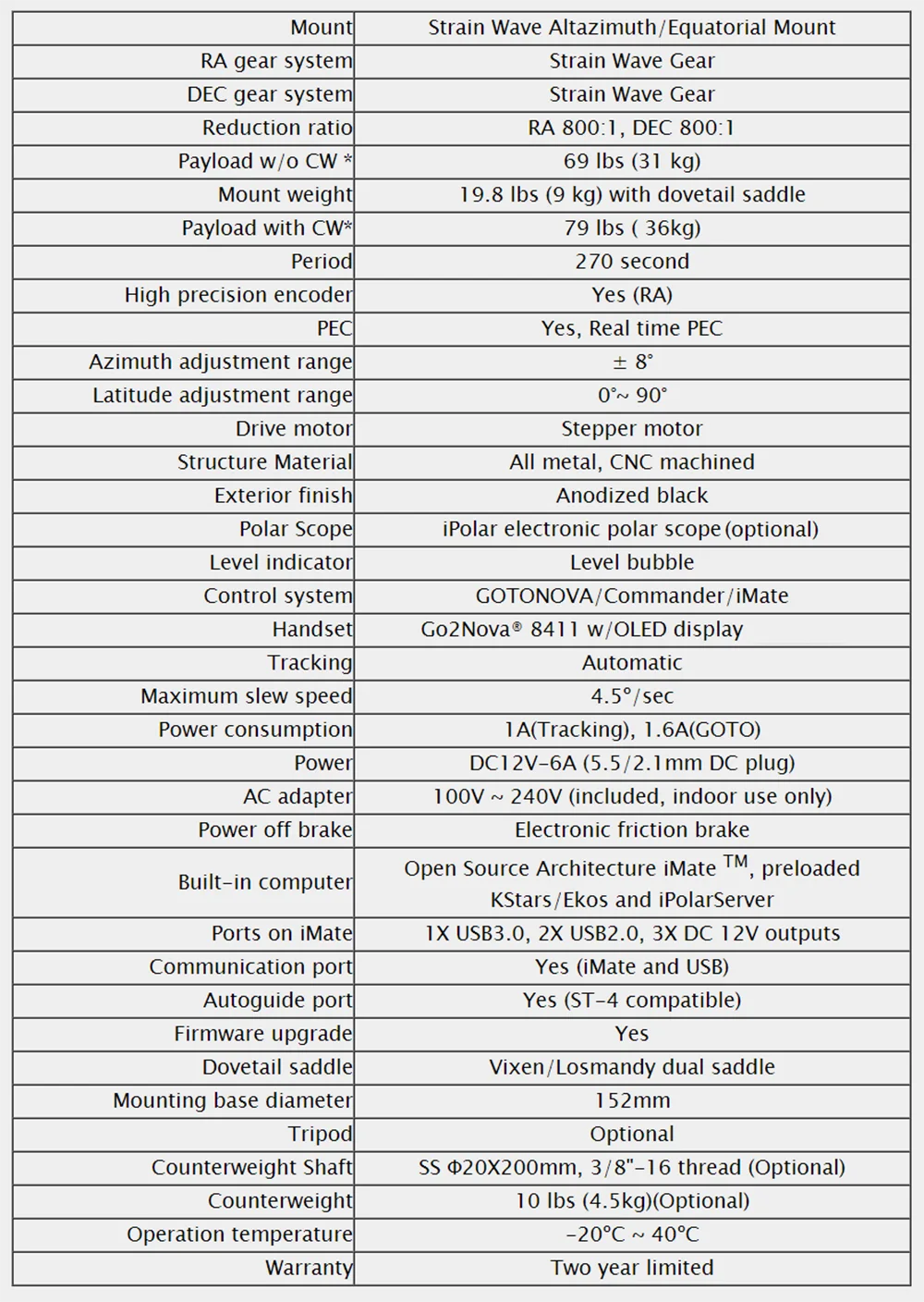 - Built-in iMate computer with WiFi, preloaded KStars/Ekos software