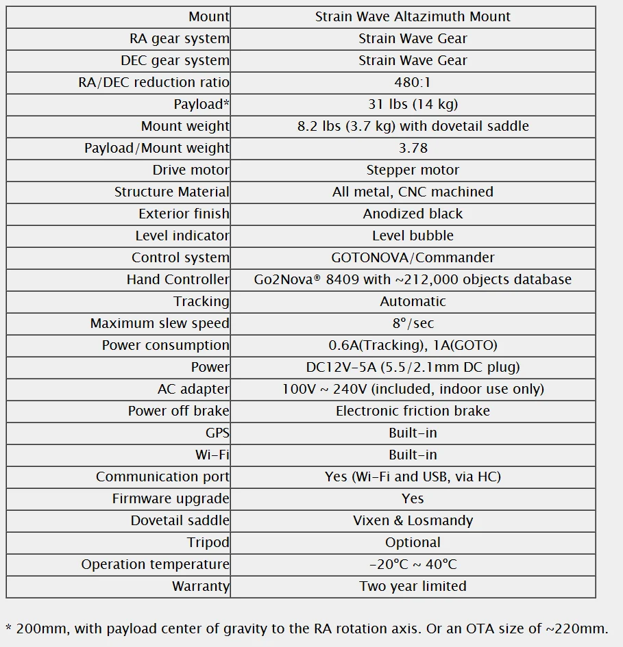 - Payload capacity of 14 kg (31 lbs) with the mount weight of 3.7 kg (8.2 lbs, include dovetail saddle)