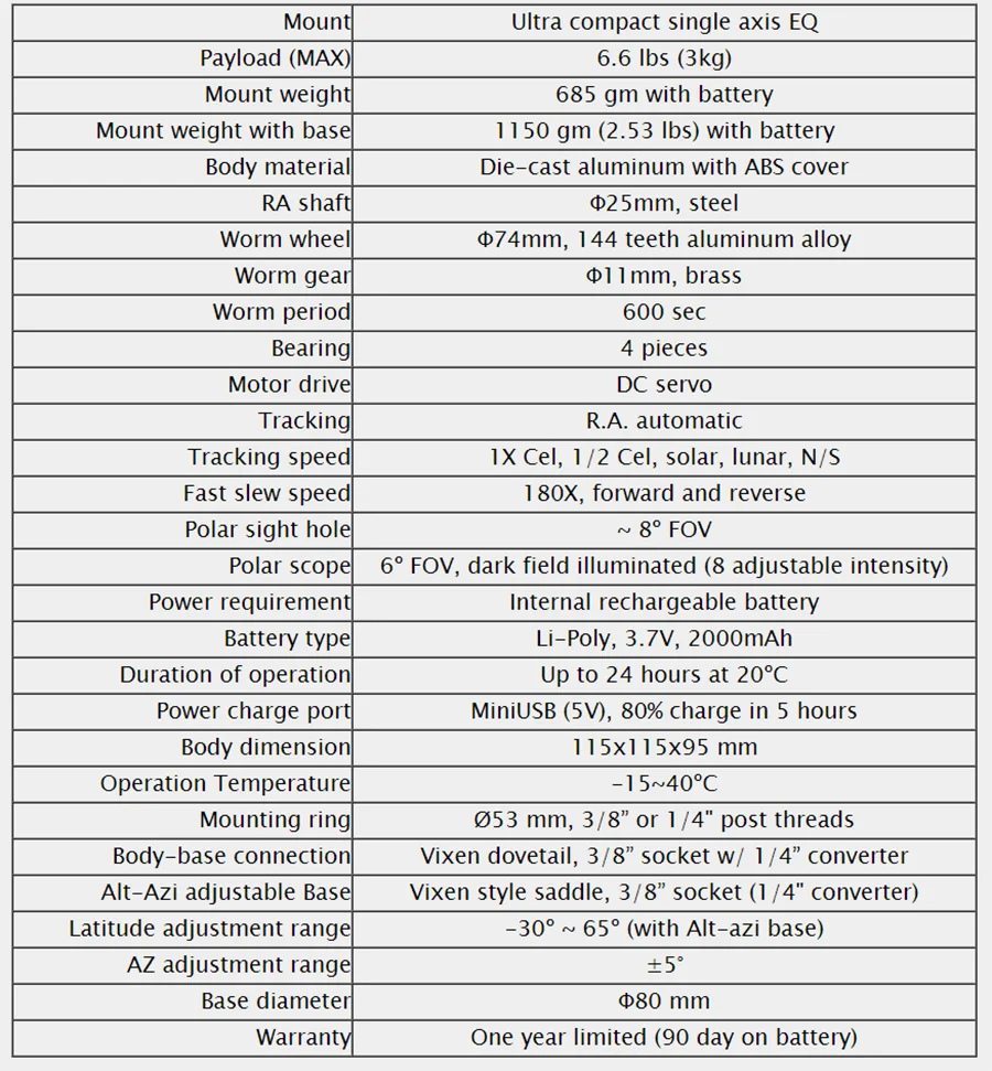 - 4 tracking speed (1X, 1/2X, solar and lunar). 1X celestial tracking for imaging the sky and stars; 1/2X tracking speed for imaging both the starry night and the landscapes at the same time