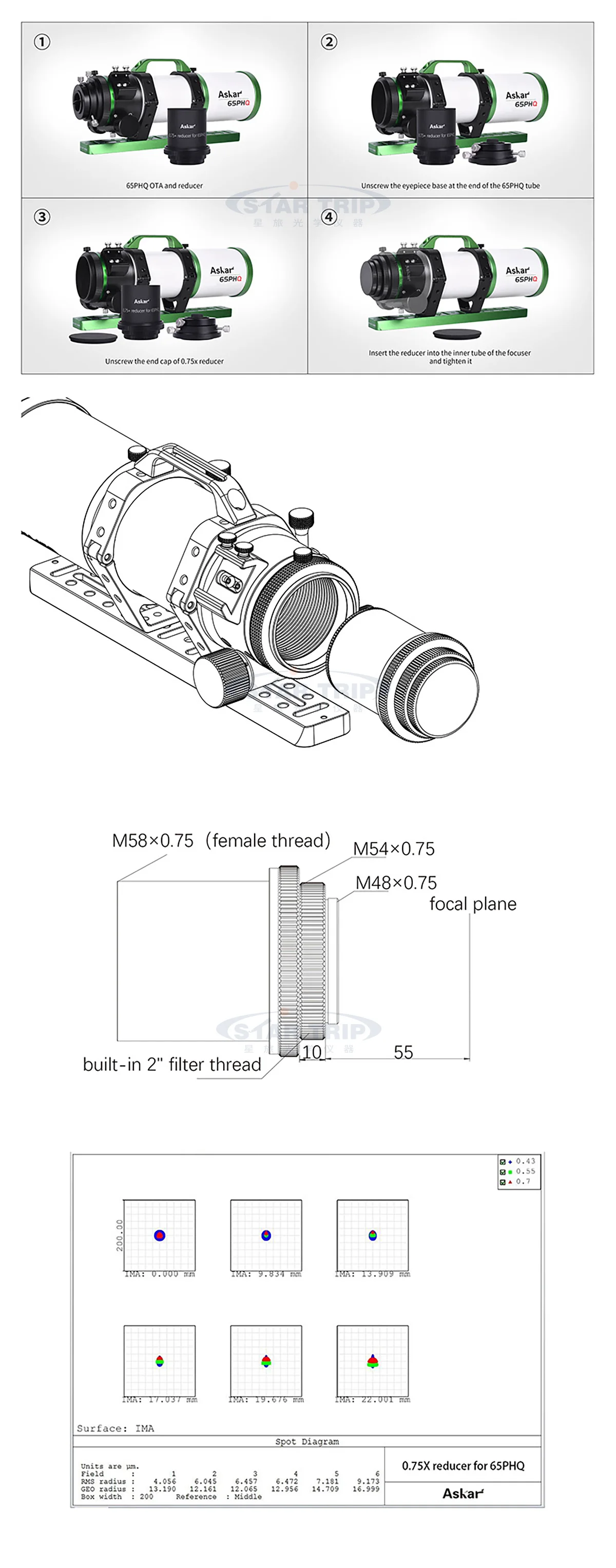 The 0.75x Reducer is supplied with two threaded adapters (M54 and M48) with a built-in M48×0.75 2” filter thread.