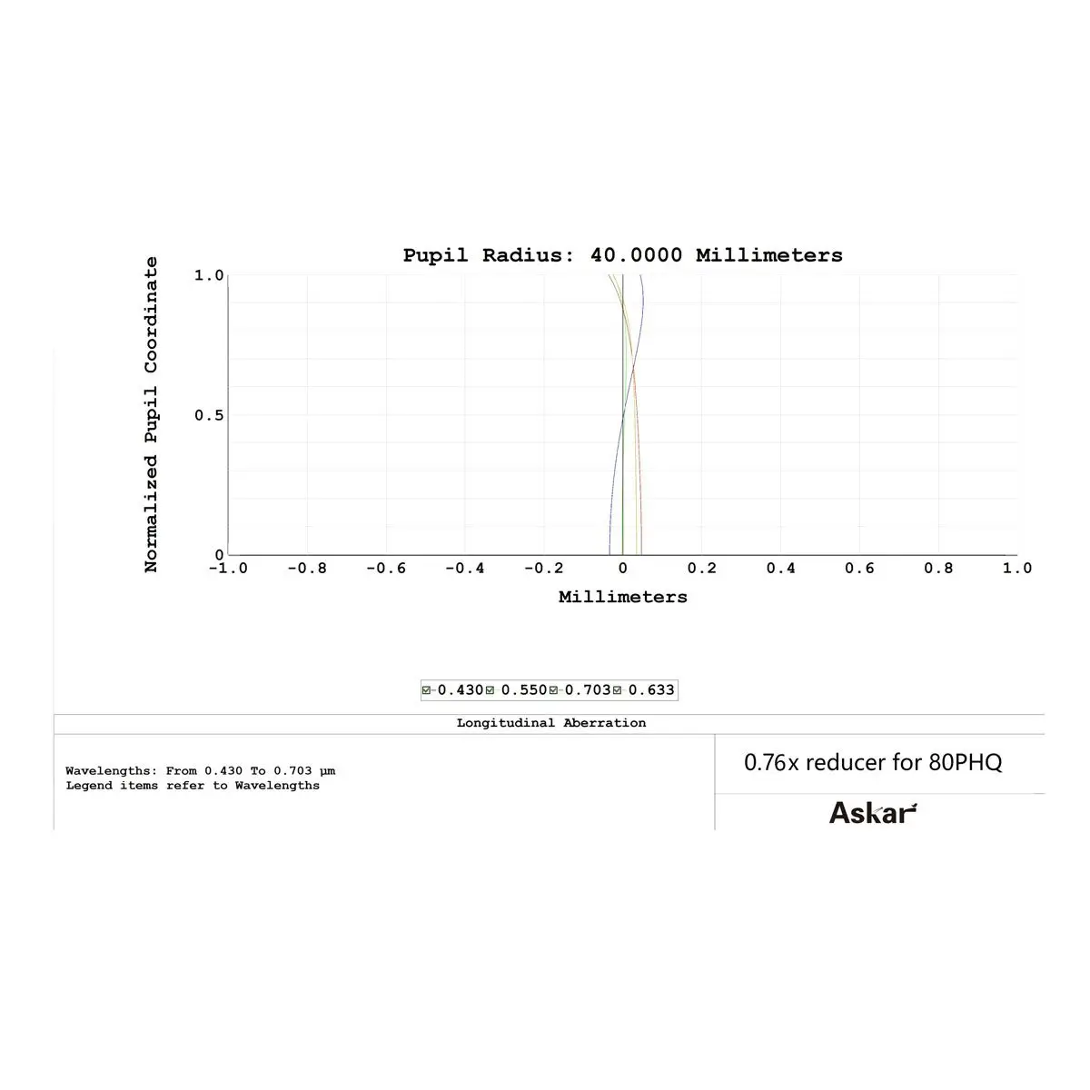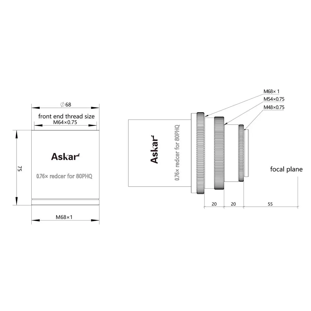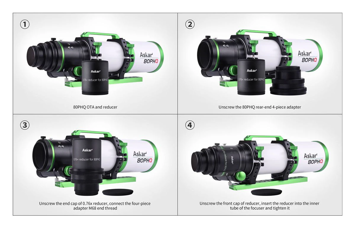 The new Askar 3" 0.76x full frame reducer, with a triplet design and specifically for the 80PHQ, offers a 0.76x reduction in focal ratio when used with the 80PHQ F/7.5 astrograph.
