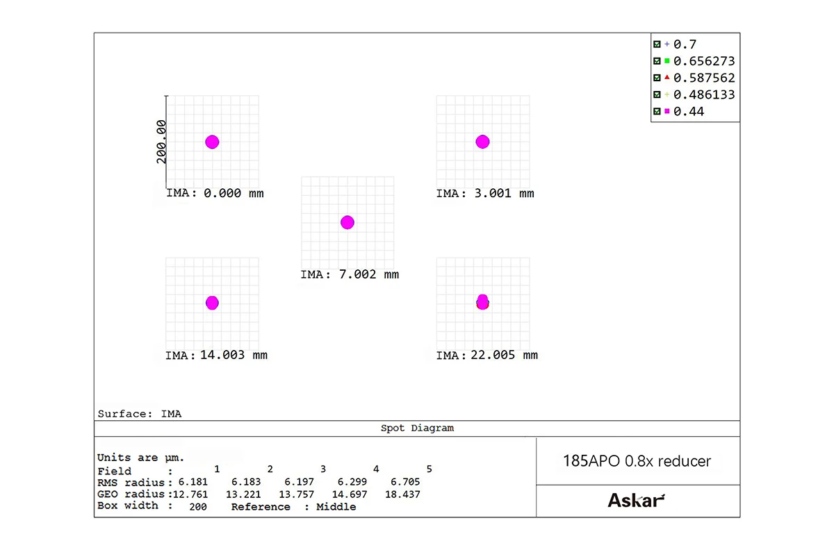 The 0.8x reducer can bring Askar 185APO's focal ratio down to F5.6. This is a standard reducer with field flattening capabilities as well. A shorter focal ratio allows the OTA to have a wider field of view and faster exposure times, making it suitable for capturing large areas of nebulae, star clusters, and faint, fast-moving celestial objects.