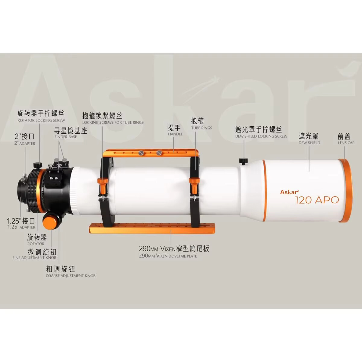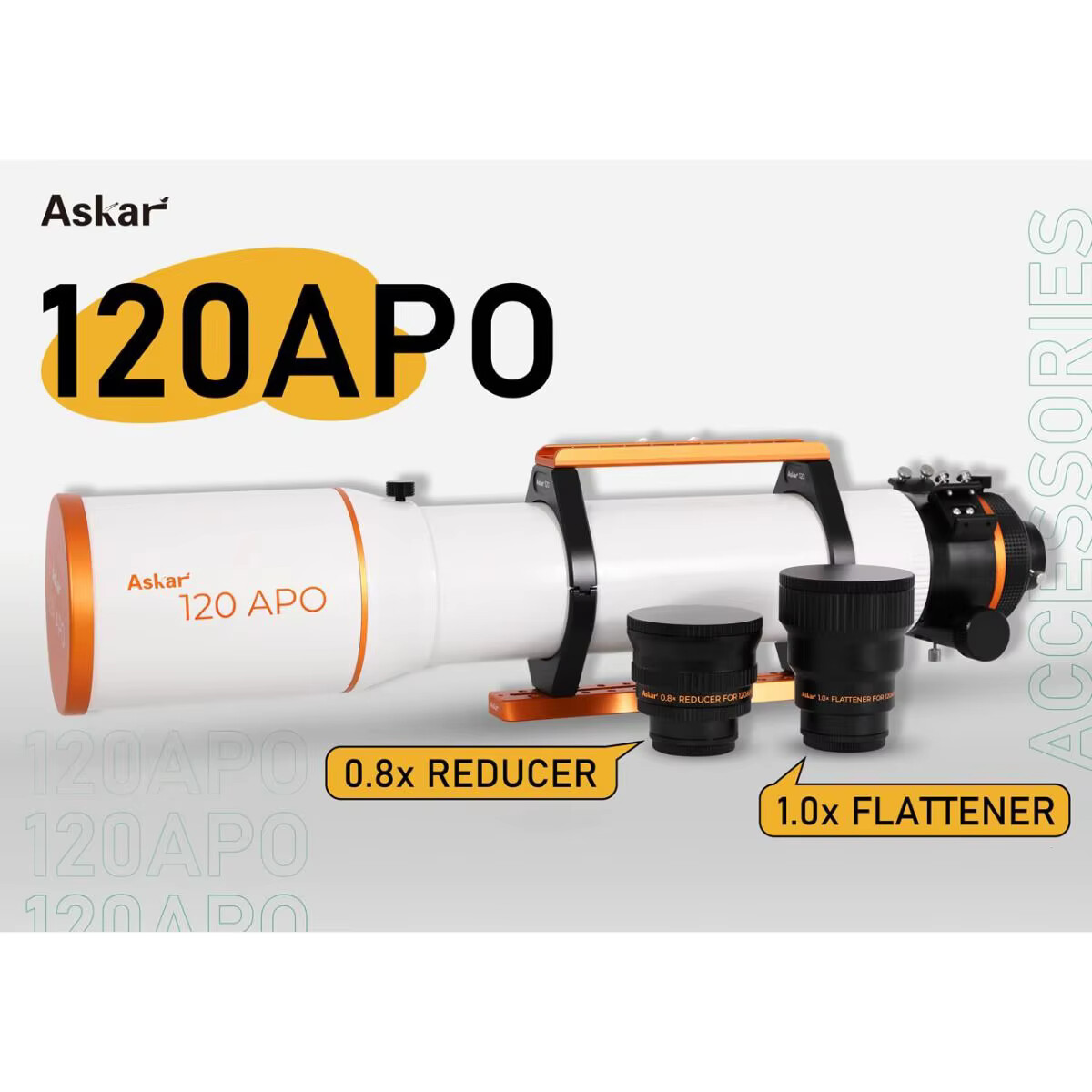 The entire Askar 120APO tube is crafted using high-quality CNC machining with anodized and painted surfaces. The orange accents on the ivory-white tube add a bright and eye-catching touch, presenting a stylish and elegant overall appearance.