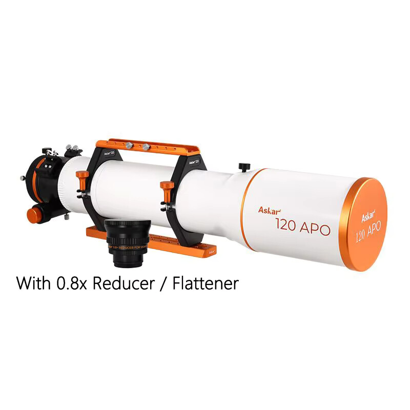 The 0.8x reducer can bring the Askar 120APO's focal ratio down to f/5.6. This is a standard reducer with field flattening capabilities as well. A shorter focal ratio allows the OTA to have a wider field of view and faster exposure times, making it suitable for capturing large areas of nebulae, star clusters, and faint, fast-moving celestial objects.