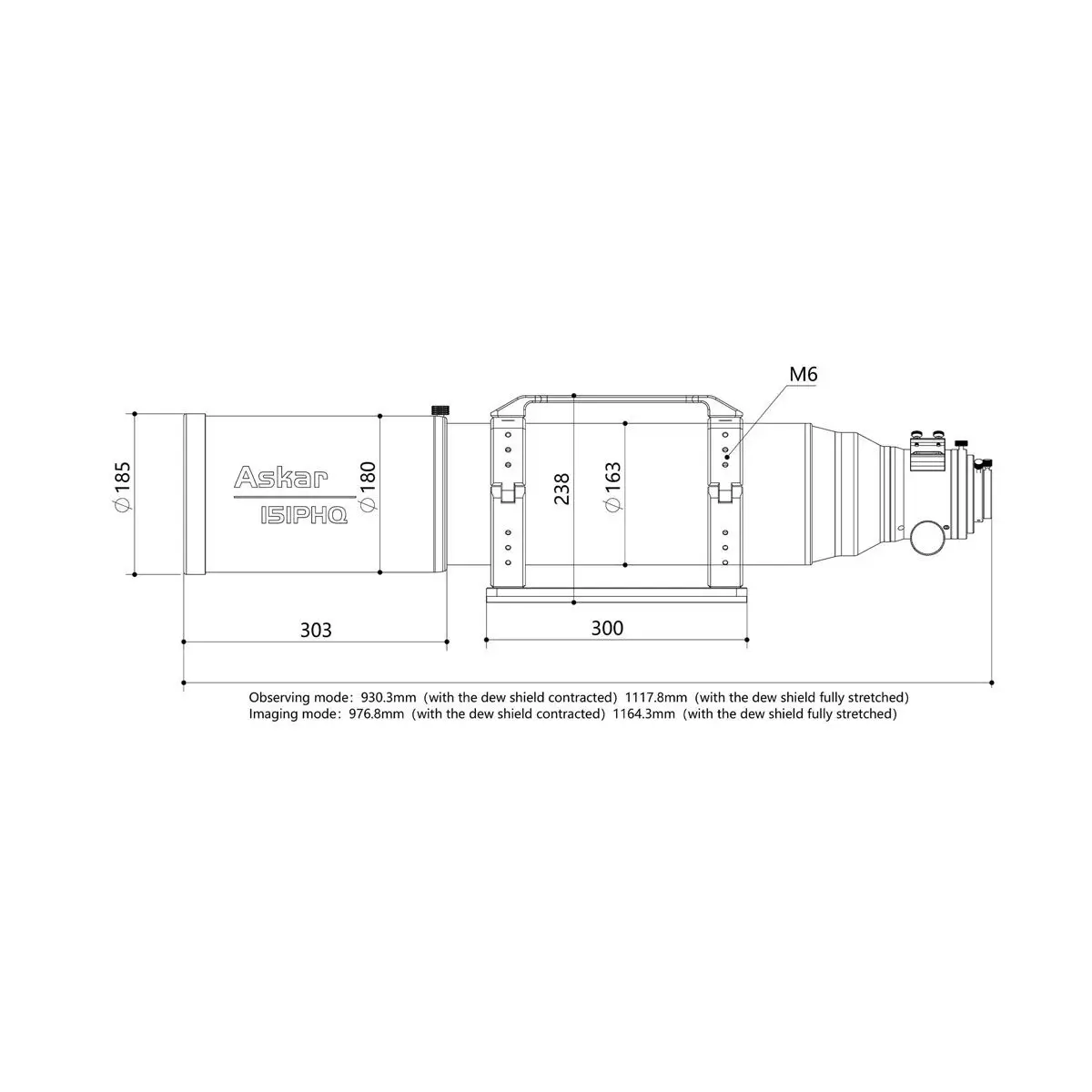 - Total length:Observing mode:930.3mm (with the dew shield contracted)1117.8mm (with the dew shield fully extended)Imaging mode:976.8mm (with the dew shield contracted)1164.3mm (with the dew shield fully extended)