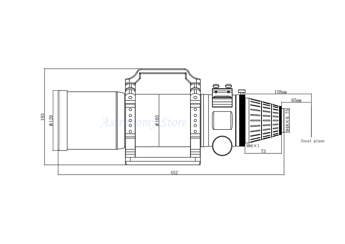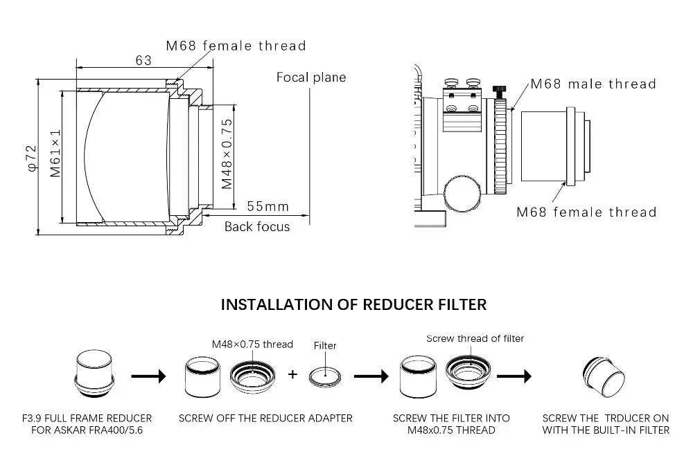 frame reducer reduces the telescope’s effective focal ratio by a factor of 0.7x, thus an original f/5.6 becomes an f/3.9 system, your exposure time will significantly shorten, providing a shorter, more optically “fast” focal ratio to make astrophotography more efficient. It designed for use with FRA400 refractor, providing a 280MM focal length for a wider imaging field of view. It achieves the 55MM back focus, and conveniently threaded for use with M48X0.75 (2") filters.