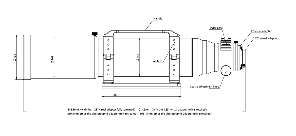 - Total length:842.5mm(including 1.25" eyepiece holder as dew shield contracted)889.5mm(including 1.25" eyepiece holder as dew shield fully stretched)1011.5mm(including the 4-piece adapter as dew shield contracted)1061.5mm(including the 4-piece adapter as dew shield fully stretched)