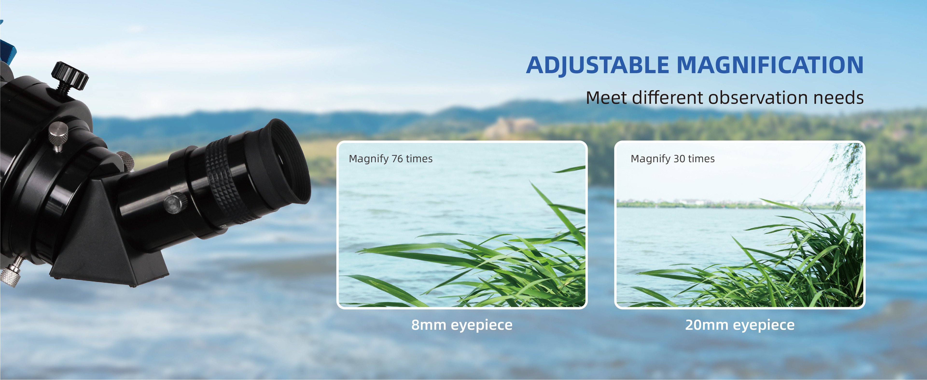 The 8mm eyepiece has a magnification of 76x and the 20mm eyepiece has a magnification of 30x.The Askar 91F can be used with different eyepieces depending on the target, and both eyepieces are ideal for viewing birds and landscapes.
