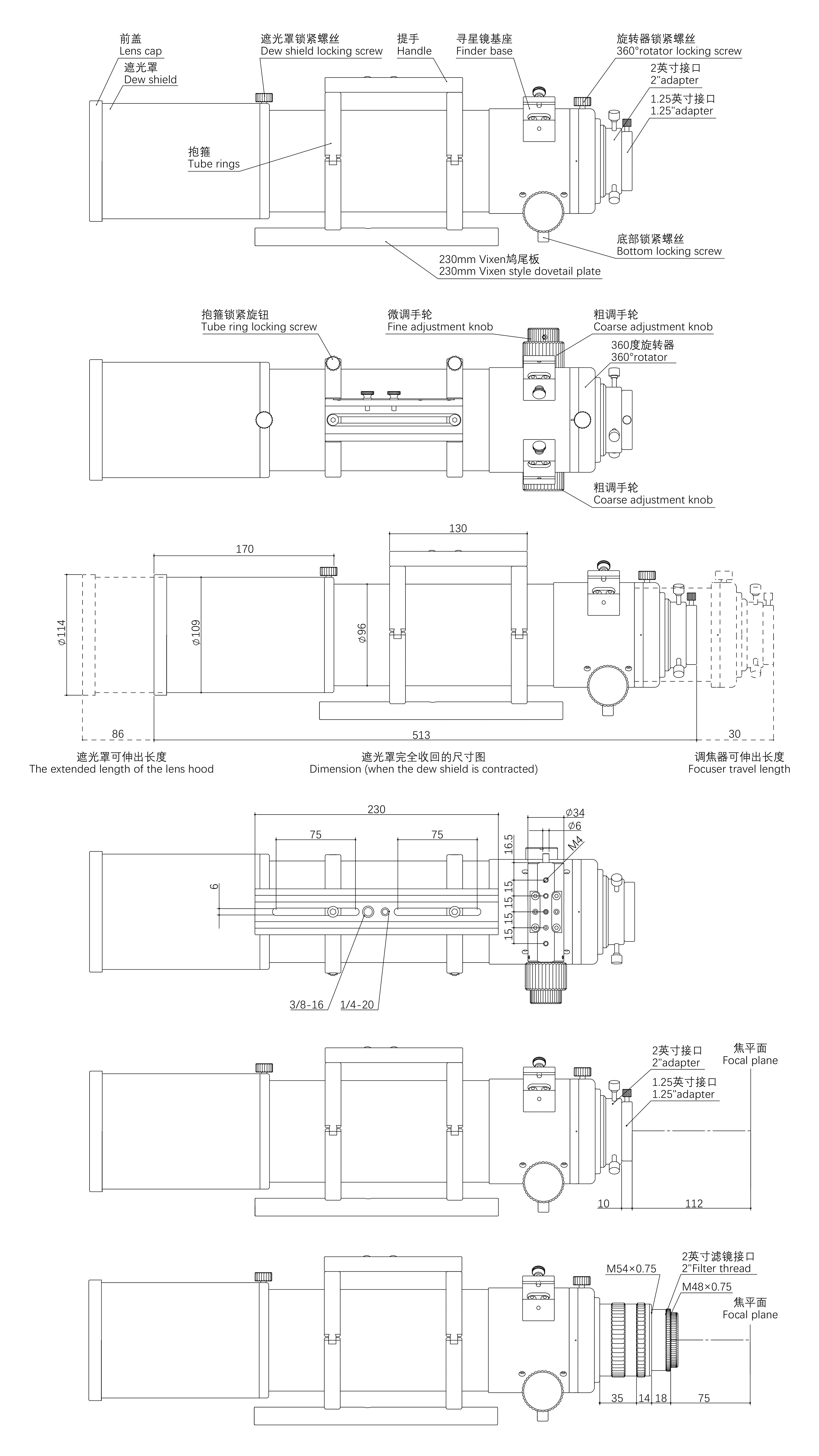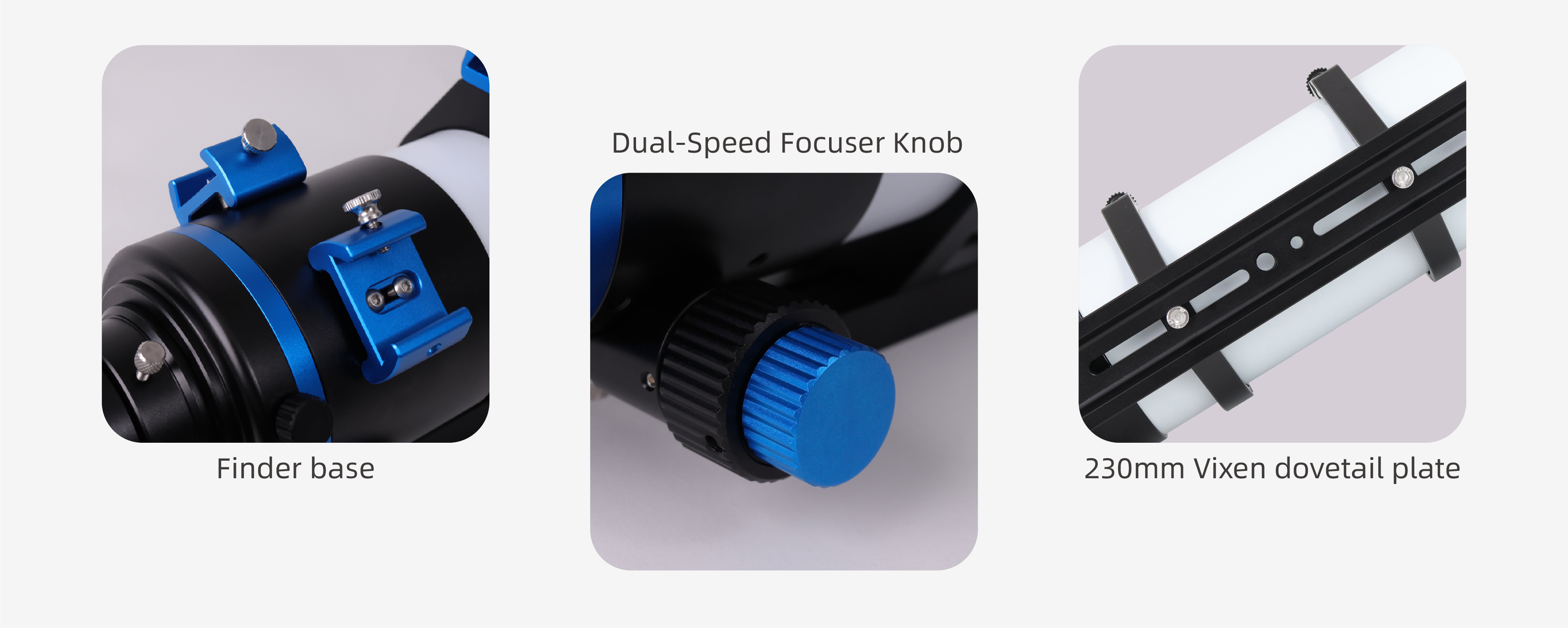 In terms of the focuser, the Askar 91F is equipped with a dual-speed R&P 3-inch rigid focuser, which has a 1:10 fine adjustment and a 360° scaled rotator at the rear end for precise angle adjustment.The 230mm Vixen-style dovetail plate includes 1/4" and 3/8" screw holes for direct tripod mounting.