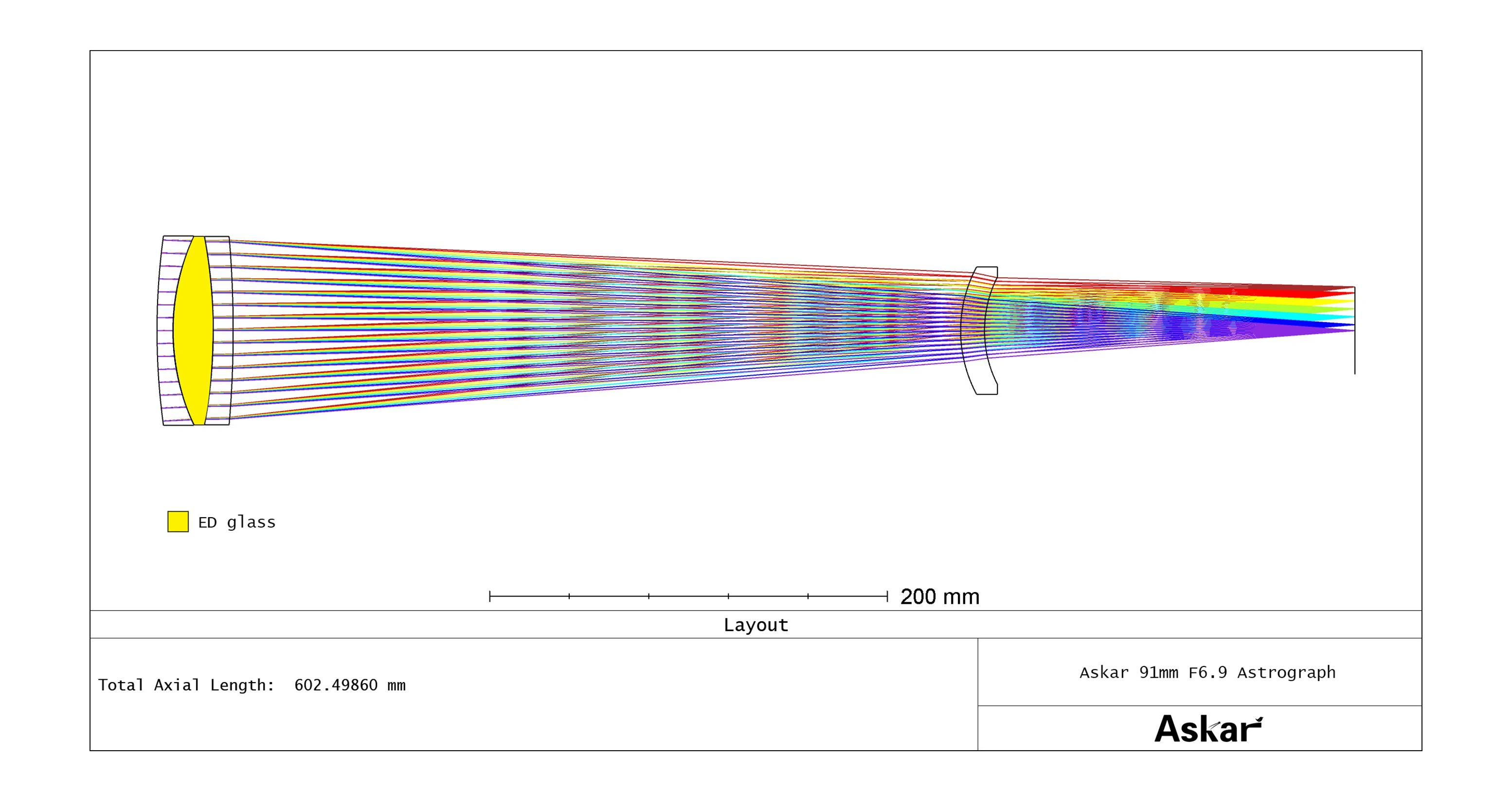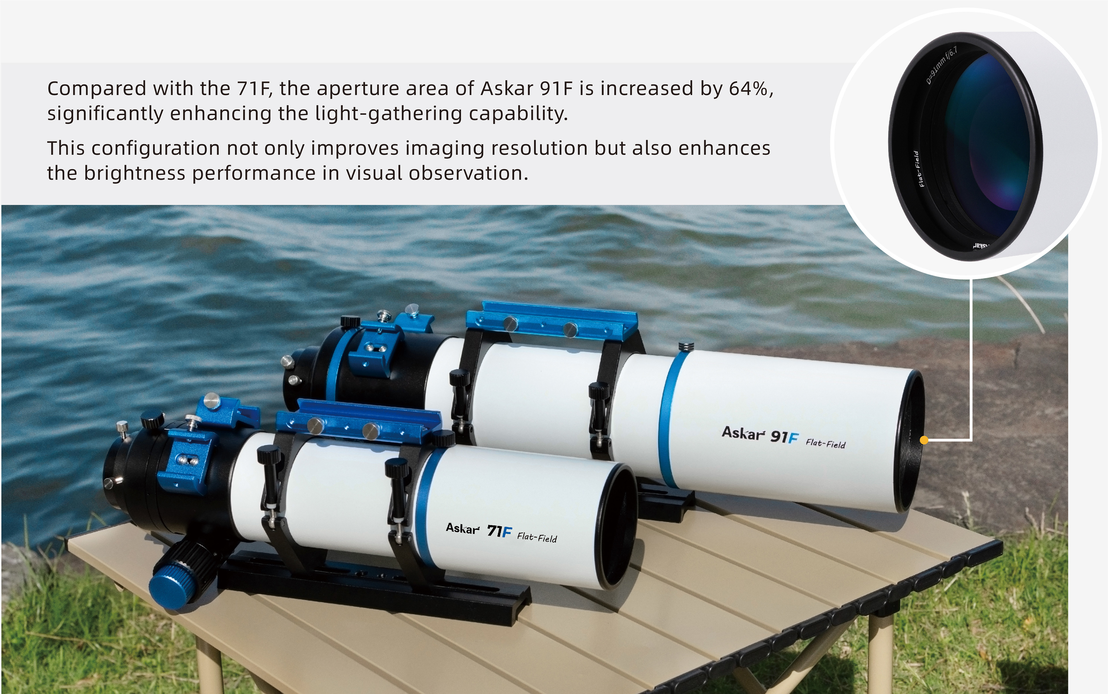 The Askar 91F is an OTA with an aperture of 91mm, a focal length of 609mm, and a native focal ratio of F6.7.