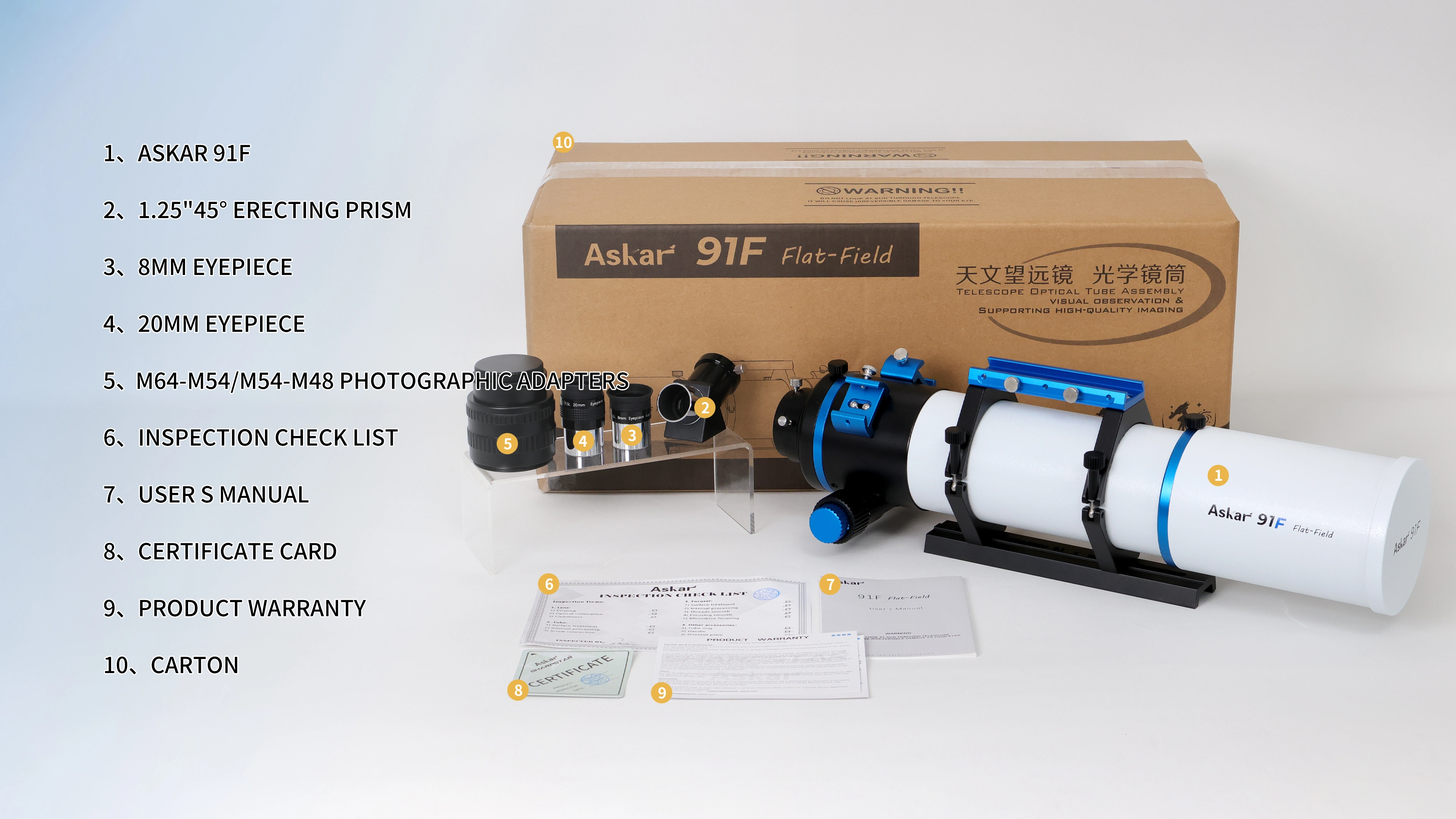 The Askar 91F is versatile in its use, allowing for both visual observation and astrophotography. For user convenience, it comes standard with three visual accessories: an 8mm eyepiece, a 20mm eyepiece, and a 1.25-inch erecting prism.