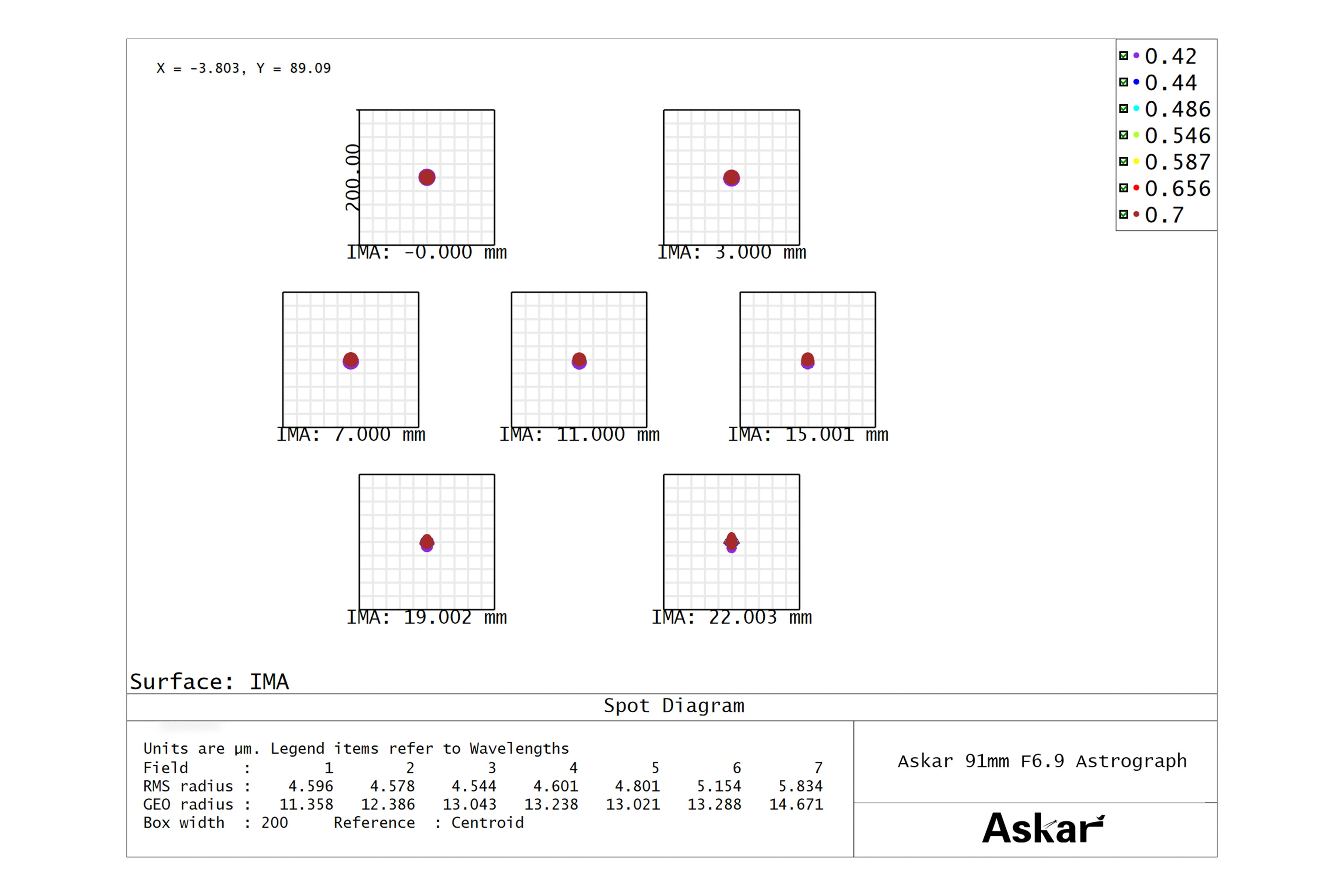The optical design of the Askar 91F features a four-element configuration (three elements in the front and one in the rear), including one piece of ED glass, which can effectively reduce chromatic aberration.The Askar 91F supports 44mm full-frame imaging with great performance of the surrounding star points.