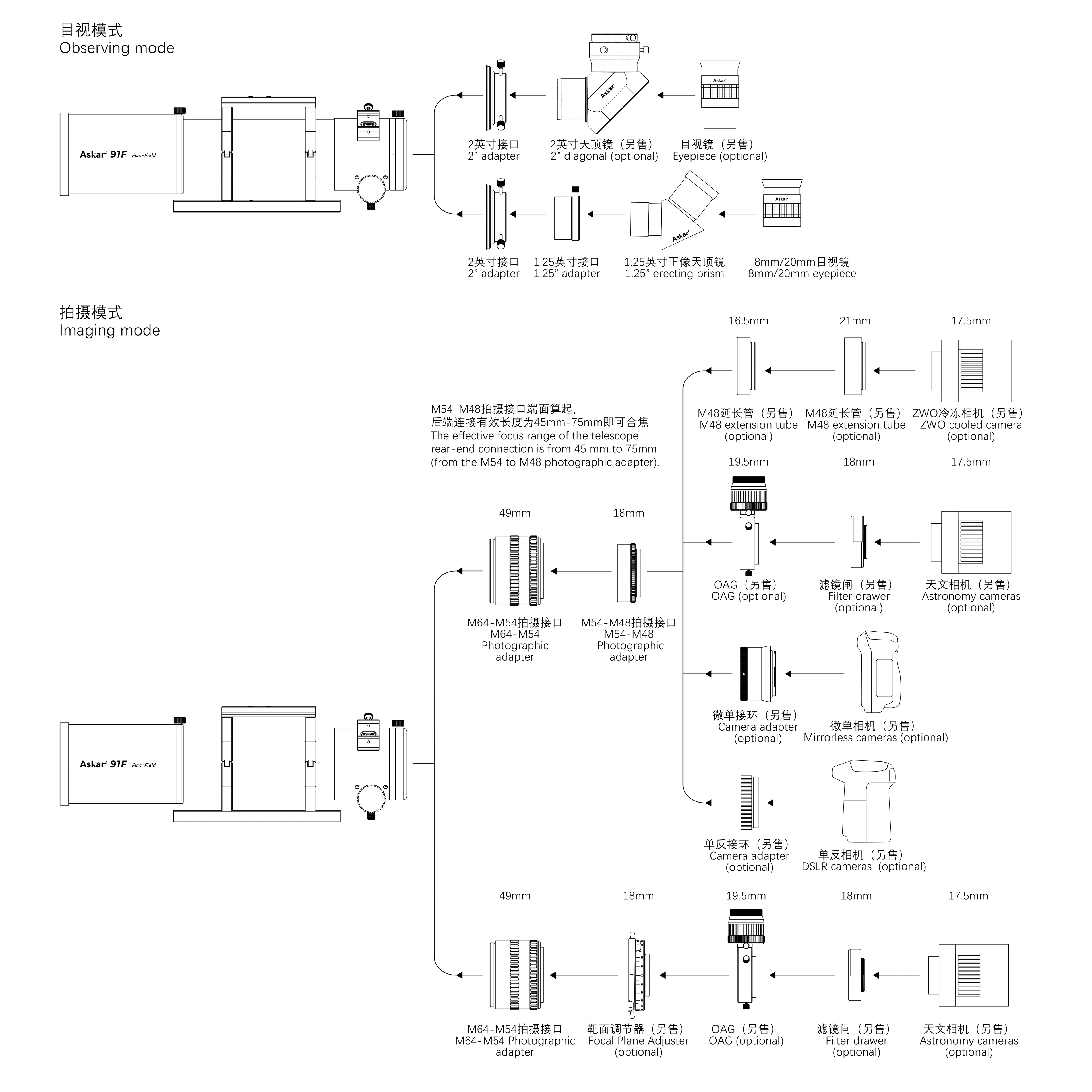 The Askar 91F also comes standard with a photographic extension tube with a built-in 2-inch filter thread for easy shooting connections, providing M48×0.75 & M54×0.75 adapters to accommodate various DSLR cameras and professional astronomical cameras, meeting diverse imaging needs.