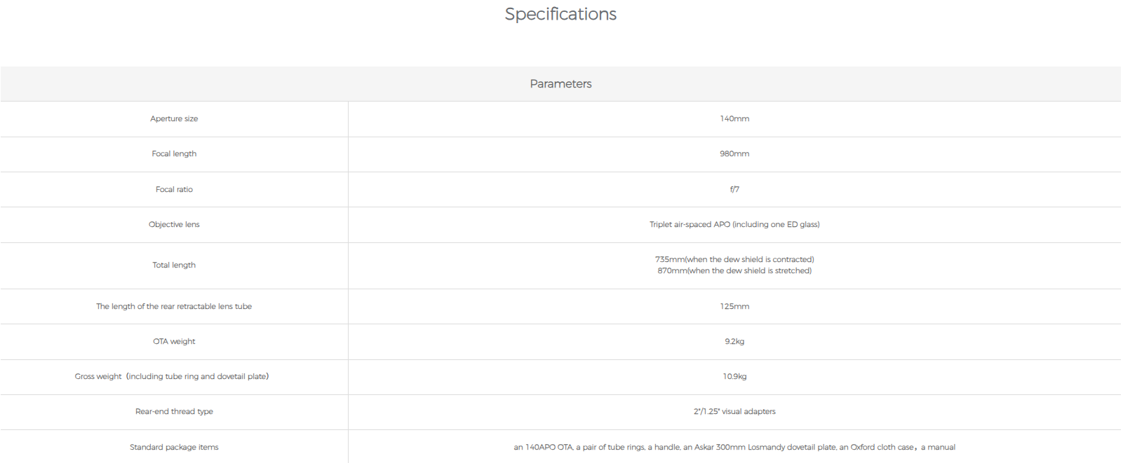 As a large aperture, long focal ratio telescope, the Askar 140APO was designed with portability in mind. The shortest overall length is only 735mm, the net weight is 20.3lbs (9.2kg), and the gross weight is 24lbs (10.9kg) including the handle, tube ring, and dovetail plate.