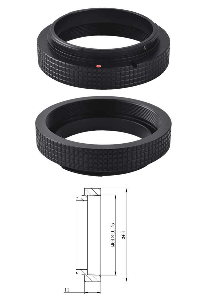 Both camera adapters are designed with female thread which is M54×0.75. The Canon camera adapter is 64mm in diameter and its thickness is 11mm. While the Nikon camera adapter is 60mm in diameter and its thickness is 8.5mm.