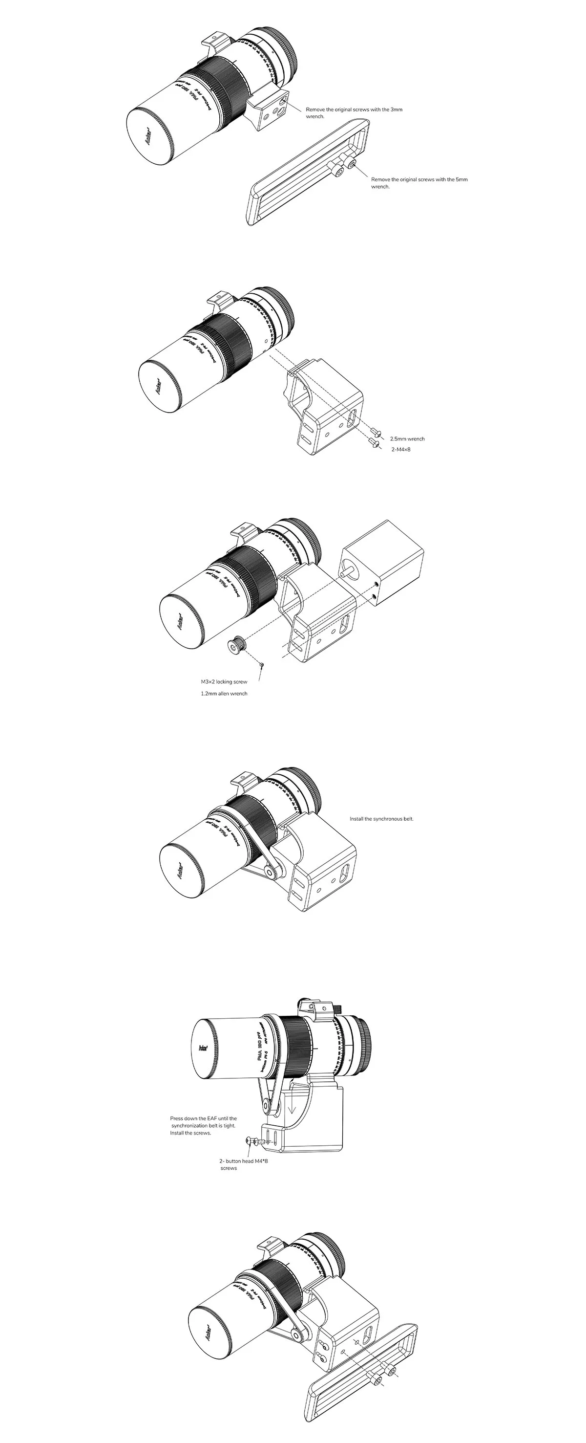5. Adjust and fix the position of the EAF, and then use two M4x8 button head screws to fix the EAF and the bracket. Place the FMA180 PRO with the bracket on the vixen dovetail plate and secure it with two M6x8 socket head cap screws. The installation of the FMA180 PRO AF Kit is done.