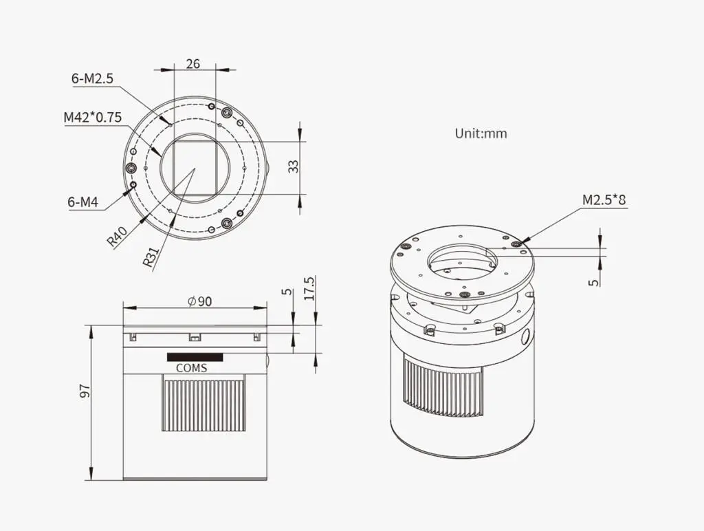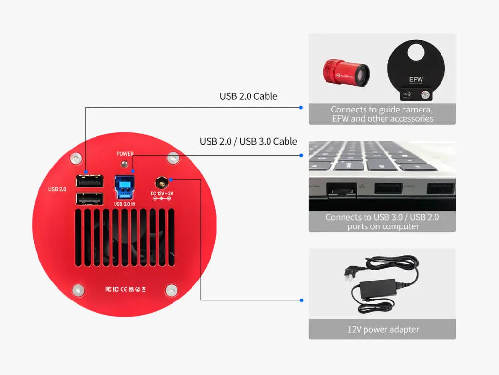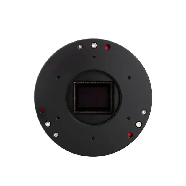 The camera incorporates a tilt plate with three sets of adjustment screws. In combination with the three mounting screws, they enable precise fine-tuning of the sensor plane for accurate alignment with the telescope’s optical axis, ensuring a flat imaging field and consistent star shapes across the entire frame.