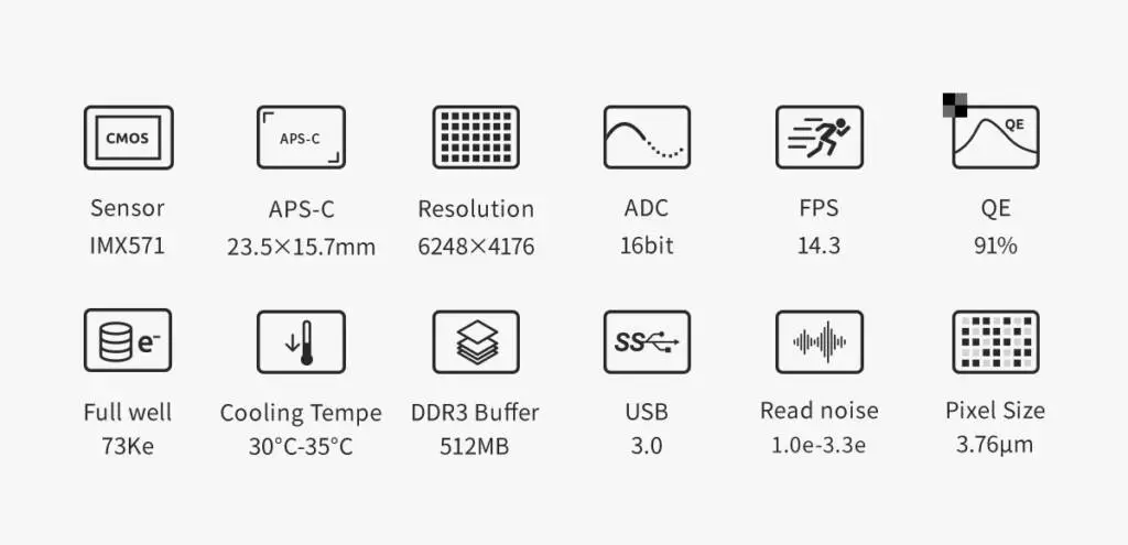 The ASI2600MM/MC Pro is equipped with the APS-C format Sony IMX571 sensor, measuring 23.5mm × 15.7mm with a 28.3mm diagonal. It delivers an outstanding resolution of 6248 × 4176 pixels, making it a true 26-megapixel powerhouse. Each 3.76 μm pixel offers an impressive full-well capacity of 73ke⁻, ensuring exceptional dynamic range and image quality.