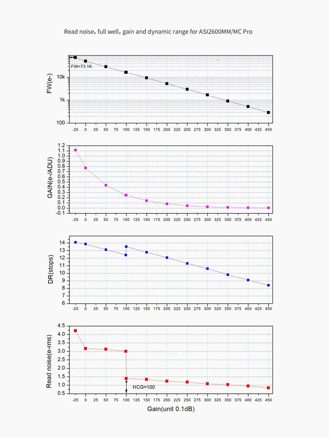 The ASI2600MM/MC Pro achieves a dynamic range of up to 14 stops. When the gain setting reaches 100, the HCG (High Conversion Gain) mode is automatically enabled, which substantially reduces readout noise while preserving dynamic range. For optimal deep-sky imaging performance, a gain setting of 0 or 100 is recommended.