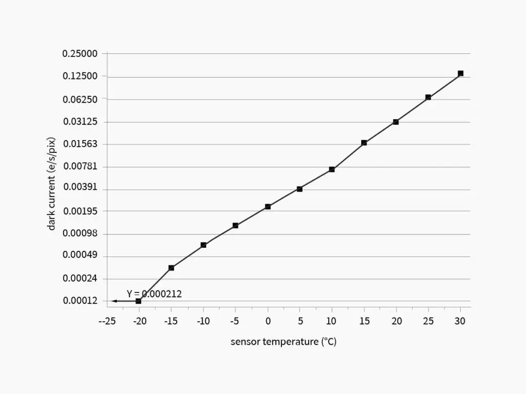 The ASI2600MM/MC Pro adopts advanced dark current suppression technology. At a cooling temperature of 0 °C, the dark current is only 0.0022e⁻/s/pix, which means that even with a 5-minute (300s) exposure, the total dark current noise is just 0.7e⁻—lower than the readout noise. At –20 °C, the dark current drops further to 0.00012e⁻/s/pix, making it virtually negligible.