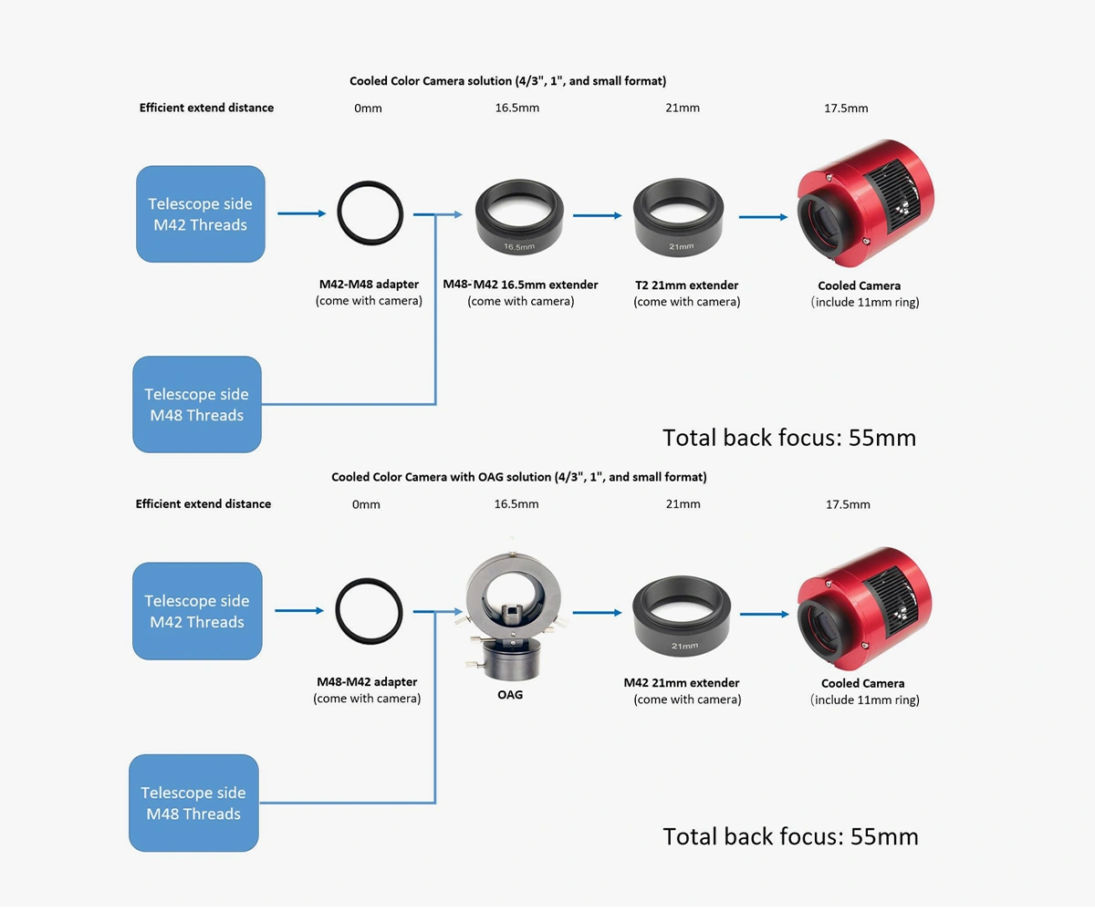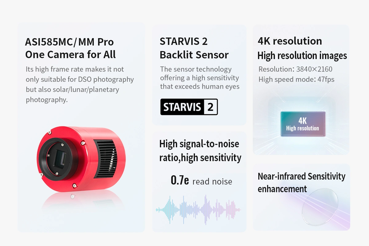 ASI585MC/MM Pro is a new ZWO deep sky camera based on the 4k SONY CMOS sensor with a 1/1.2″ format and 2.9μm pixels. It has a super high sensitivity and a large resolution of 3840*2160 (8.29MP in total). It also features high transmission speeds – In high-speed mode, the fast frame rate can reach 47fps with low read noise at full resolution! It also features a high SNR and high sensitivity, especially in near-infrared wavelength. Being an entry-level DSO camera, it offers great advantages of high cost-effectiveness.