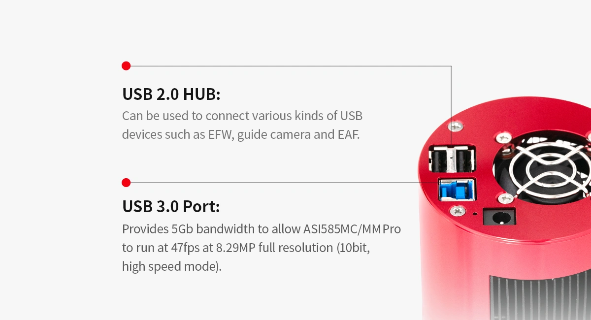USB 3.0 Port: Provides 5Gb bandwidth to allow ASI585 to run at 47fps at 8.29MP full resolution (10bit, high-speed mode).