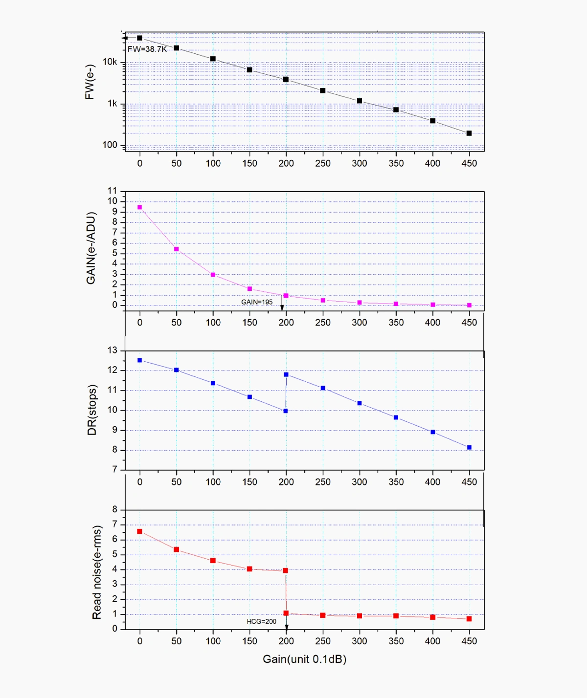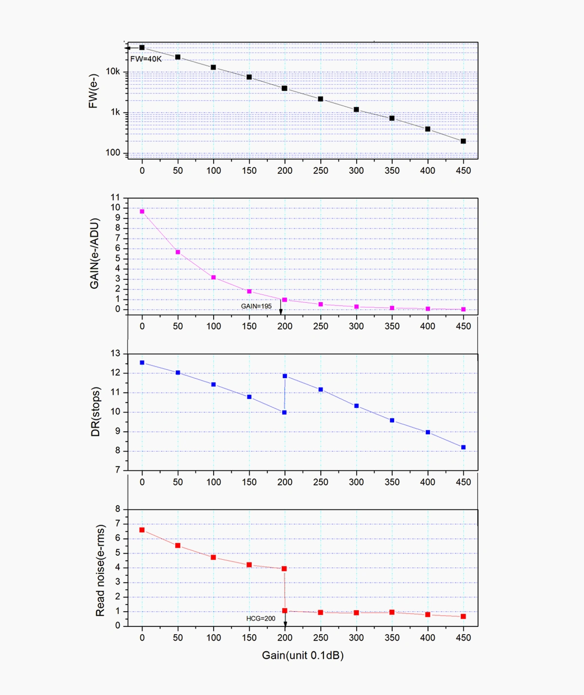 When the gain reaches 200, the HCG mode will be automatically turned on and the dynamic range reaches a level close to 12bit. The read noise in this case can be as low as 0.7e.