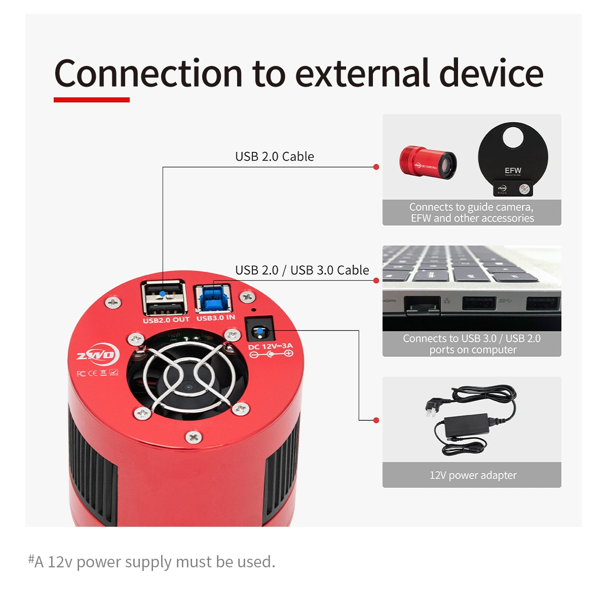 External power supplies are needed for all ASl-cooled cameras. We recommend you use a 12V@3A~5A DC adapter (D5.5×2.1mm, center pole positive) or a lithium battery with 11-14V to power the camera. Be aware that using a power supply out of this voltage range will probably lead to irreparable damage to the camera.